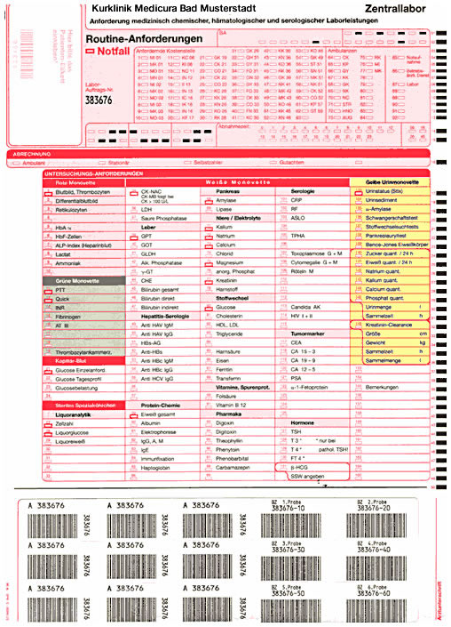 Hier sehen Sie vier Beispiele für die Konzeption medizinischer Laborformulare mit und ohne Barcode-Etikettierung.Die Formulare werden nach den spezifischen Anforderungen der Einrichtungen gestaltet.